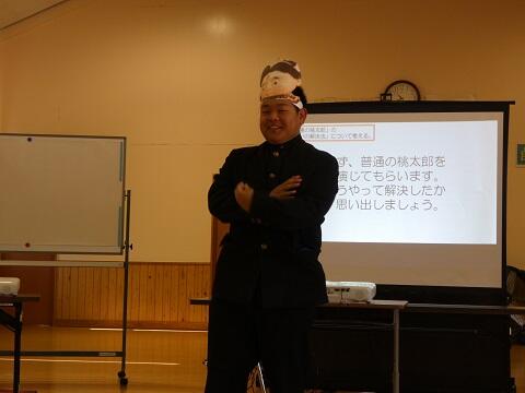 <桃太郎の劇を見ながら、桃太郎がどのように問題を解決していったか、桃太郎の方法が本当に良いのか考えます。>