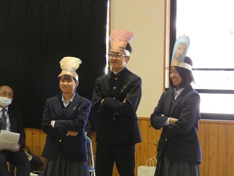 <まずは、各学年の代表が3学期の目標を述べてくれました。1,2年生ともに勉強や学校生活についての目標でした。3年生は間もなく始まる入試に向けての意気込みを述べてくれました。各学年ともに気が引き締まる発表でした。>