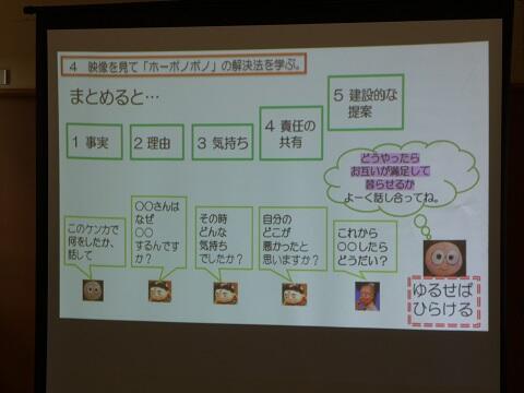<今日やることをみんなで確認します。ケンカや争いが起きたとき、どうやって解決すれば良いのかを考えます。>