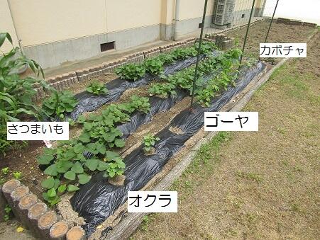 全体的にツルが伸びて、特にさつまいもは大きく成長しました。ゴーヤは花が生えてもうすぐ実がなりそうです。かぼちゃとオクラも順調に成長しています。