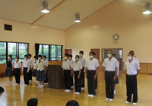 引き続いて、全校集会を行いました。6月の延岡地区中学校総合体育大会柔道競技で3位に入賞し、県大会に出場する長嶺玲來さんの授賞式がありました。