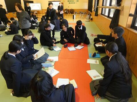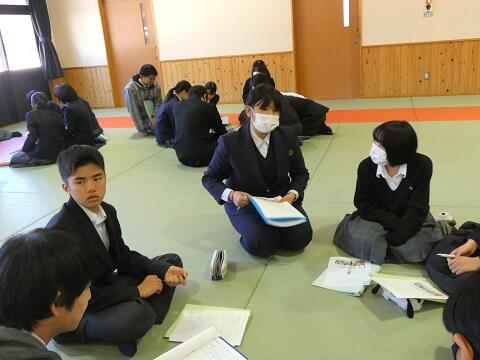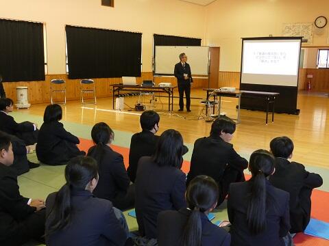 <次に校長先生からのお話がありました。校長先生からの問いかけとして「会話」と「対話」の違いは何か?がありましたね。ただ喋るだけなら会話です。対話には「対」の文字が入っています。対には「対等」の意味が込められています。対話とは、相手の話に耳を傾け、相手の考えや意見も尊重しながら、新しい価値を創り出すことです。どんな人にも優しく誠実なコミュニケーションが、これからの社会で求められています。北川中学校の生徒も、相手を思いやる気持ちを大切にしましょう!>