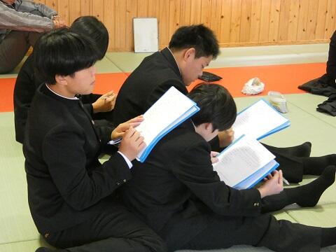 <まずは、各学年の代表が3学期の目標を述べてくれました。1,2年生ともに勉強や学校生活についての目標でした。3年生は間もなく始まる入試に向けての意気込みを述べてくれました。各学年ともに気が引き締まる発表でした。>