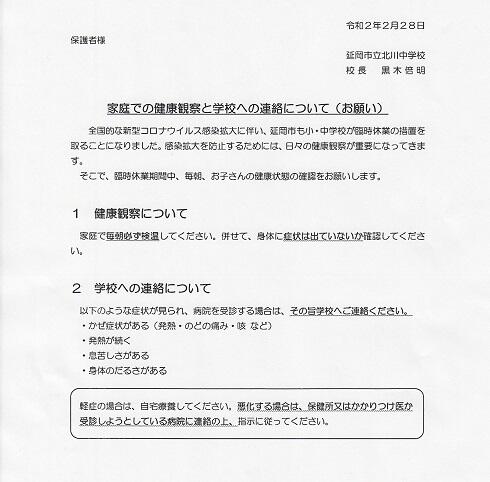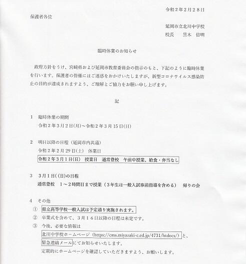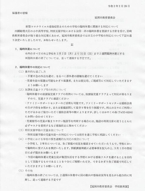 新型コロナウイルス感染症対応に伴う、延岡市教育委員会の対応(一斉臨時休業)についてお知らせします。