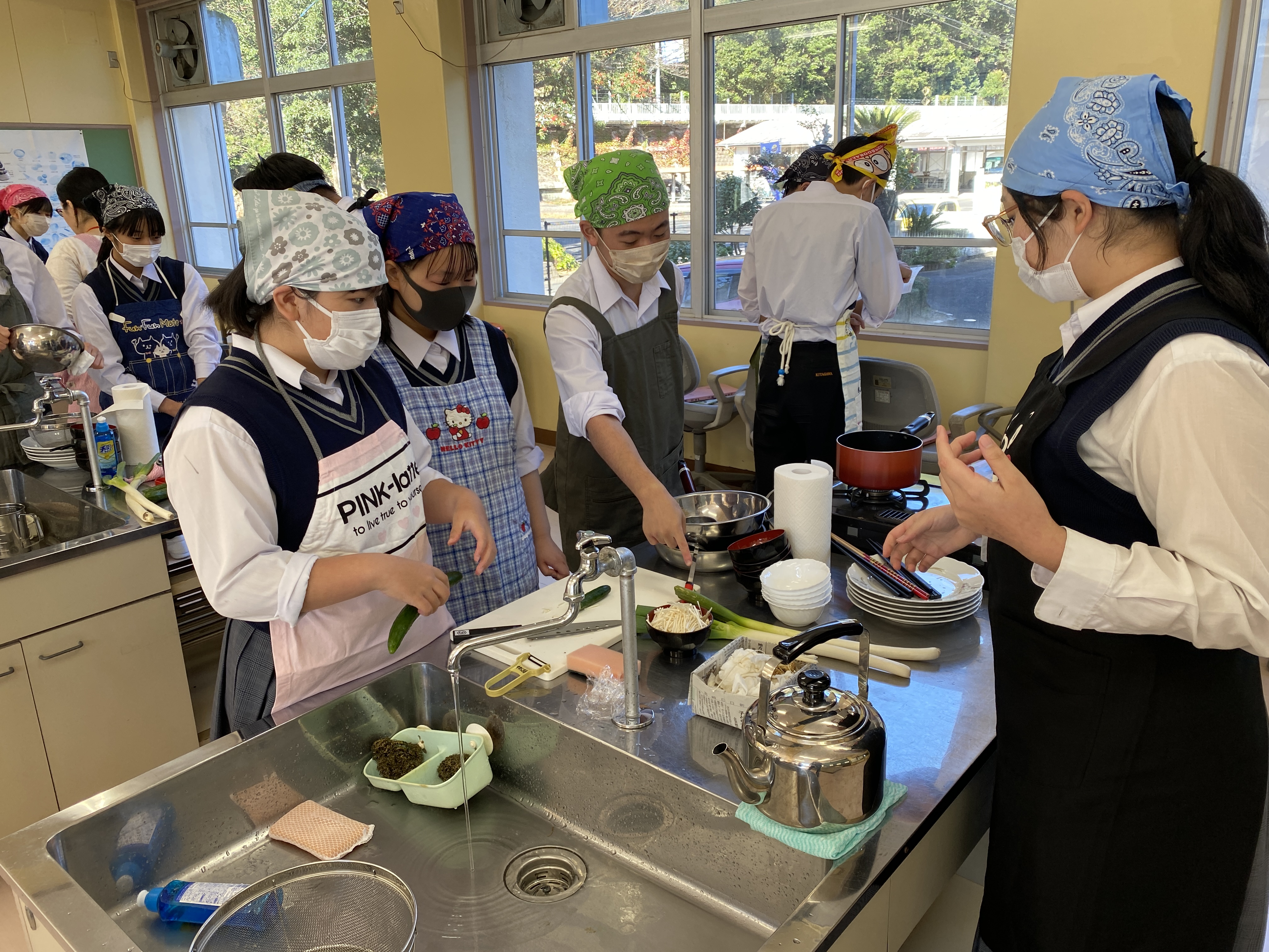 3年生になると3品を同時進行で作らなければなりません。材料を切る人、調味料の分量を量る人、和える人、煮る人、みんなで協力し合って作りました。