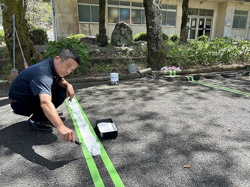 来校された方が安全に駐車ができるように学校技術員の先生を筆頭に手作業でライン塗りを行いました。