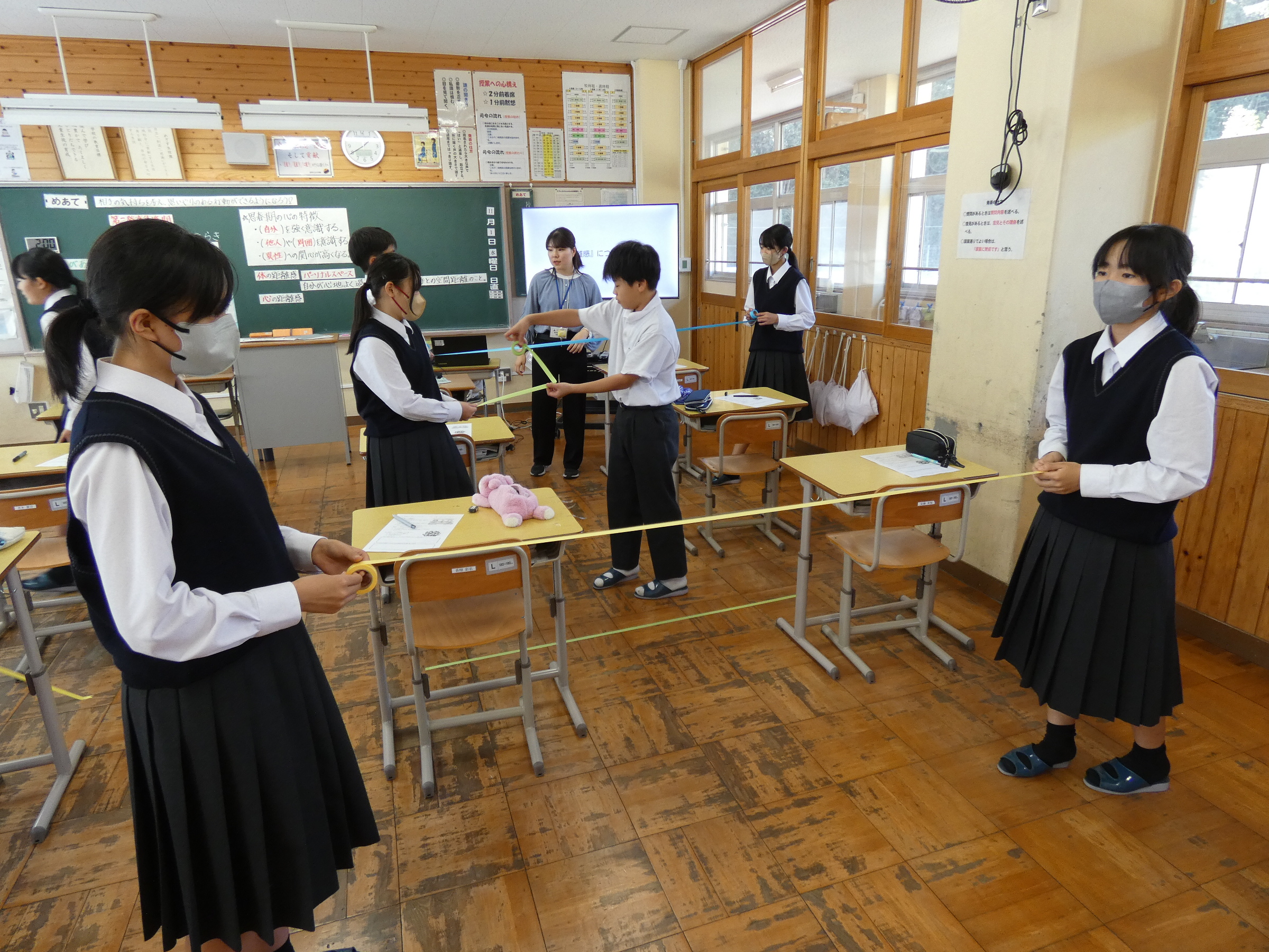 自分と相手との距離を実際にカラーテープを用いて、知らない人とのパーソナルスペースと親しい友達とのパーソナルスペースを計りました。