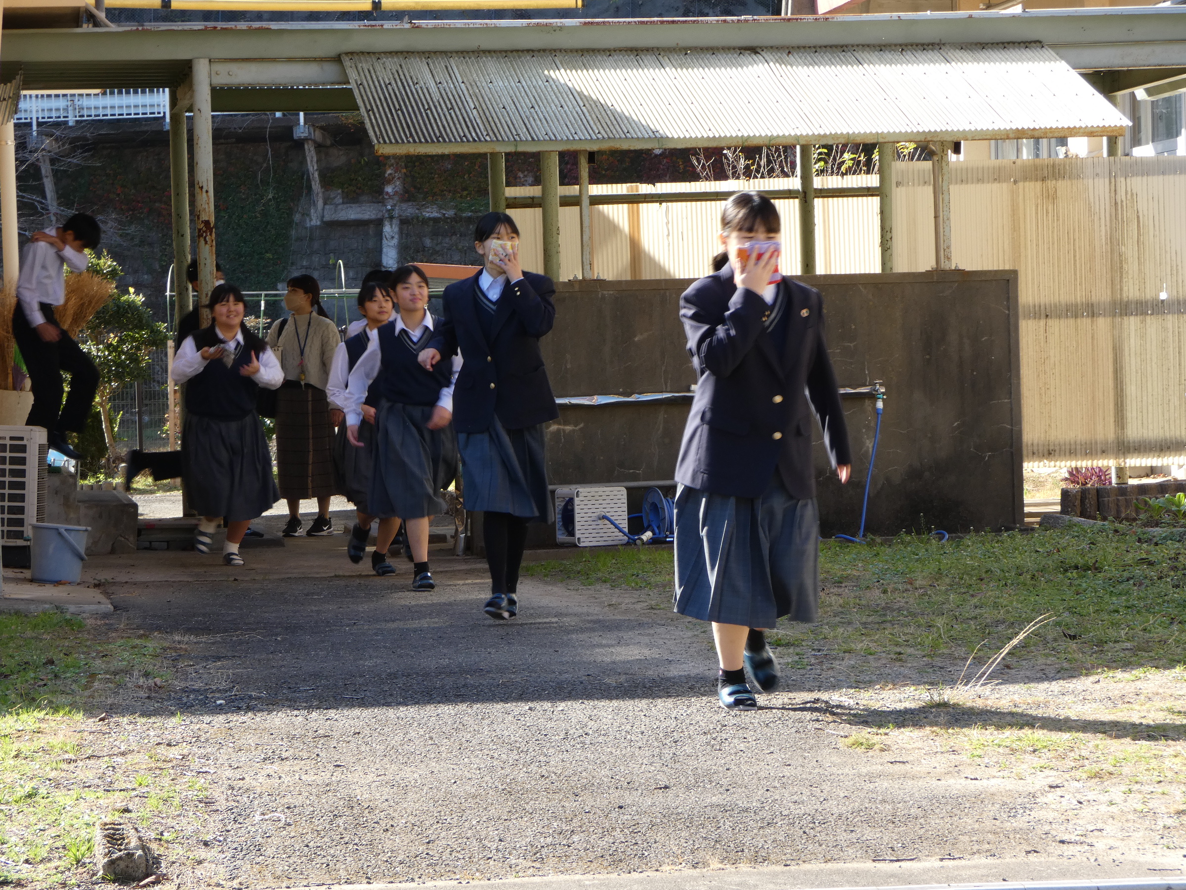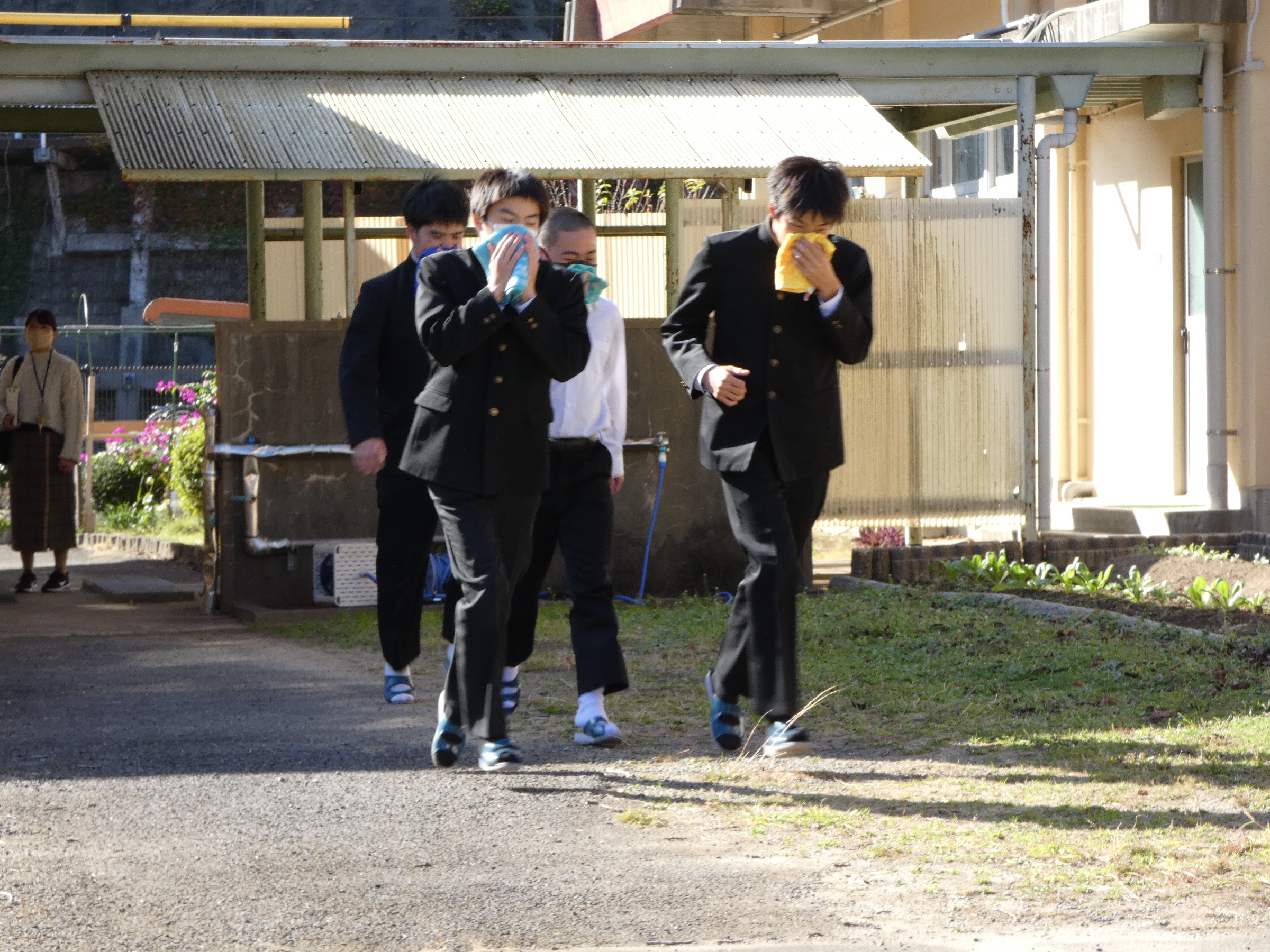 火災発生の放送を聞き、生徒たちは窓を閉め、ハンカチ等で口元を押さえながらグランドへ避難しました。