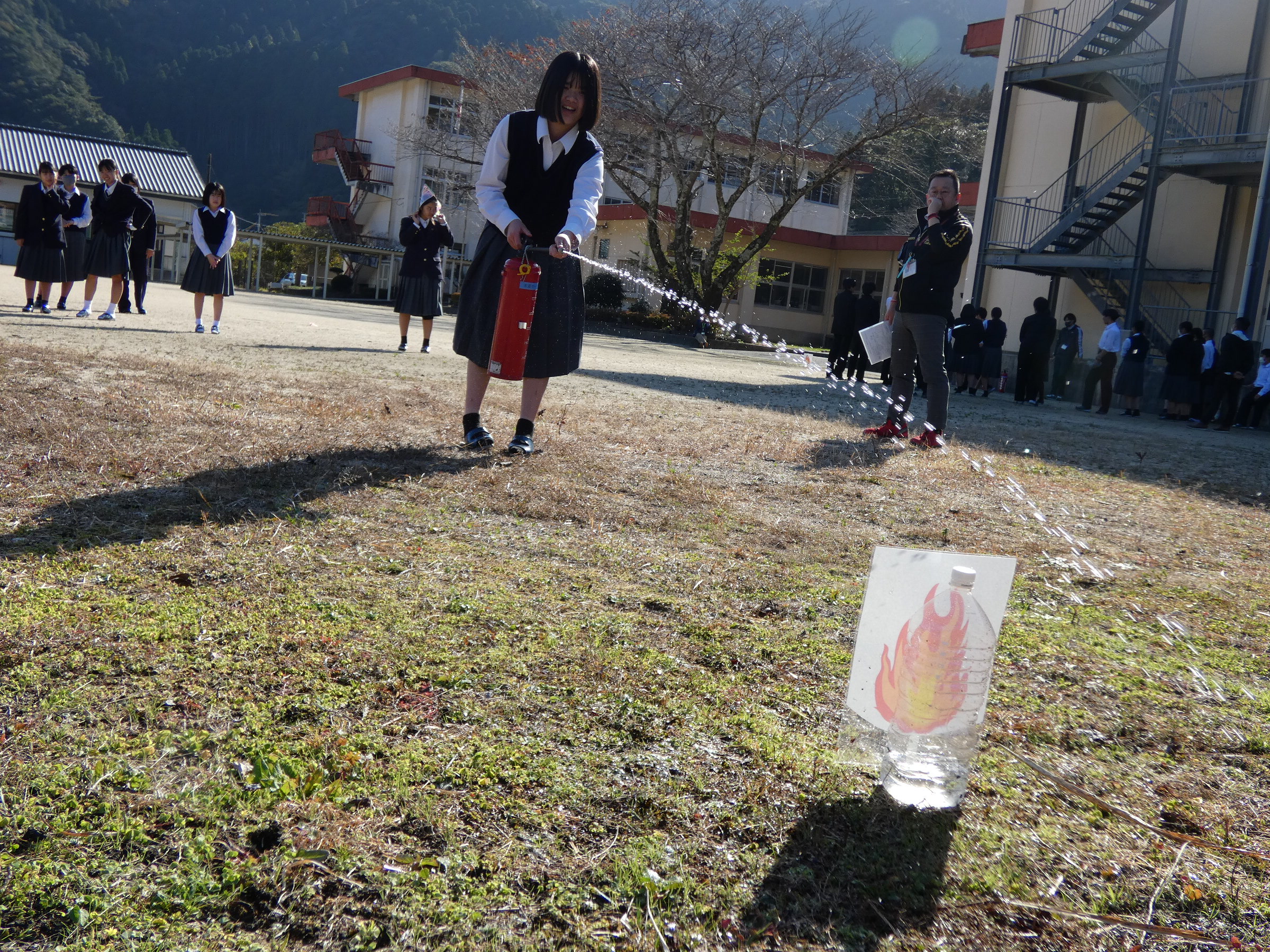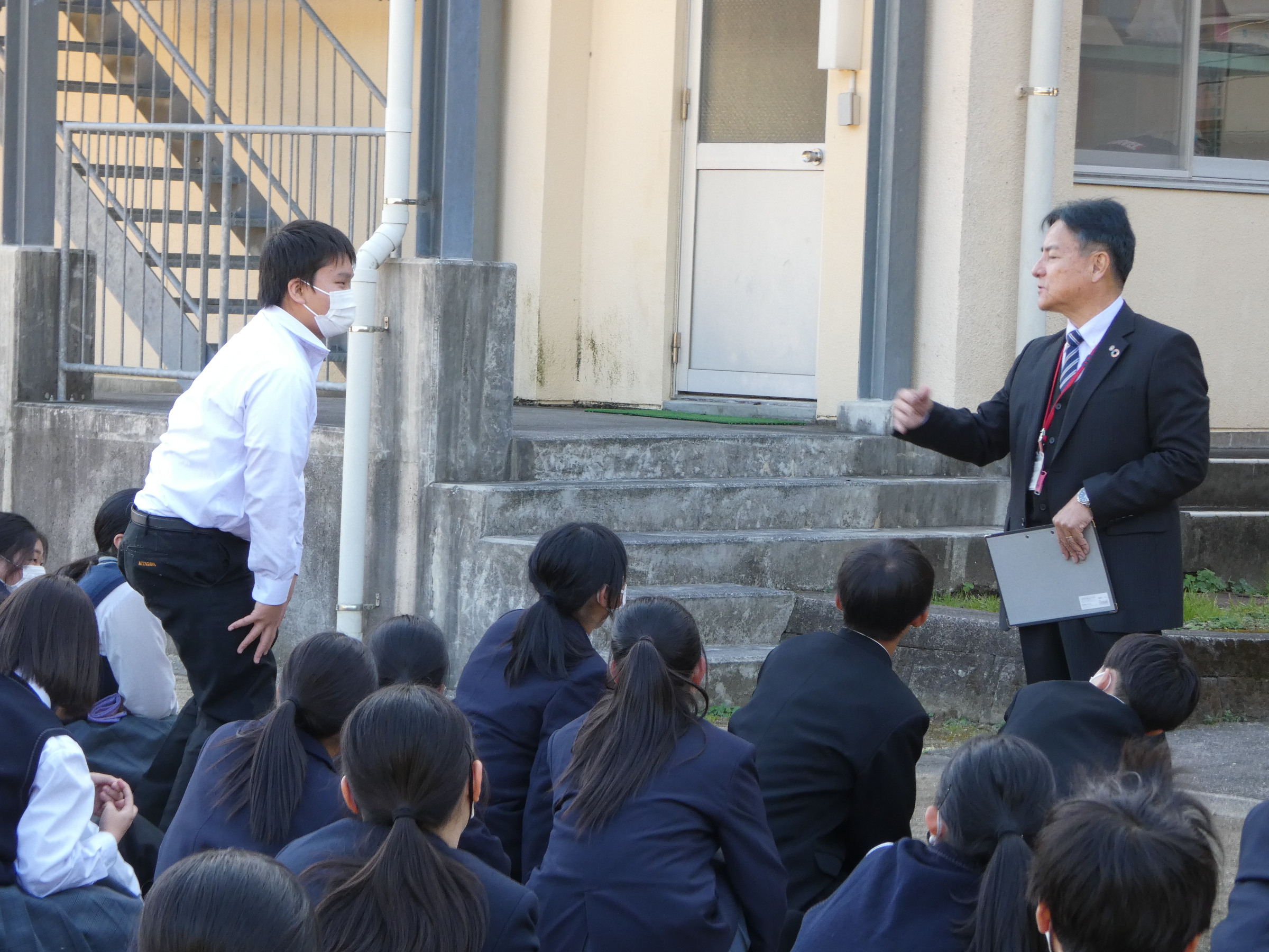 校長先生からの講評では、学校の消化器についてお話がありました。自分たちが学習する教室のどこに消化器があるのか?学校にはいくつの消化器があるのか?家に消化器はあるのか?どこにあるのか?生徒たちは、学校生活を振り返りながら校長先生の問いを考えていました。