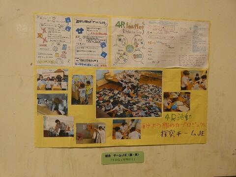 4Rと服の寄付活動の様子をまとめを発表しました。授業でいろんな事業所に電話で服の寄付をお願いしたり、夏休み期間に各事業所を訪れた様子を見ました。活動への取り組みの努力が集まった服の写真でとても伝わりました。