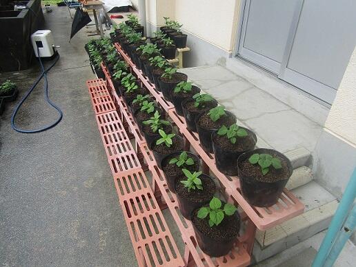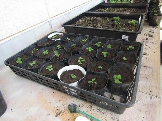 6月中旬、小さなポットに植えた花たちが大きくなると、今度は大きなポットに移します。