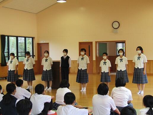 全校集会では、始めに今日から3日間、宮崎産業経営大学からスクールトライアルにこられた2名の大学生の紹介をしました。