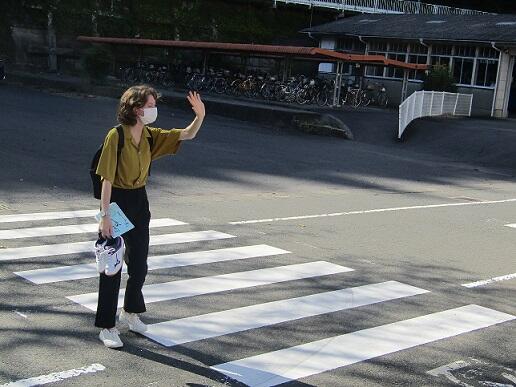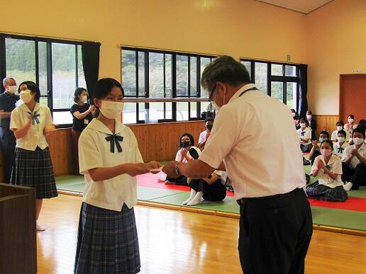 本校職員が生徒代表に渡し、その後全校生徒に配付しました。生徒たちは通学時等の安全対策として、スクールバックに付けて登下校をしています。
