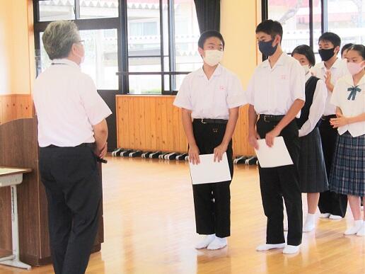 延岡地区中学校秋季体育大会(9月25日~27日)の激励式を、6校時後に武道場で行いました。