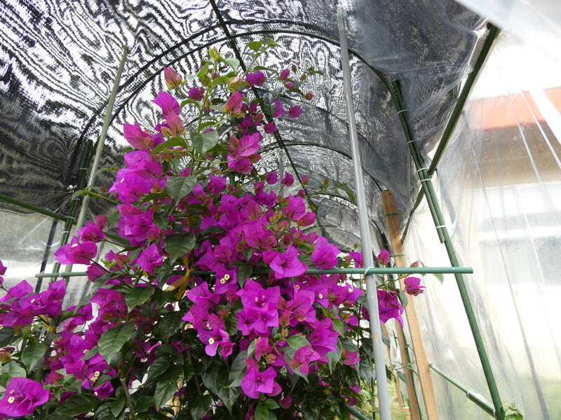 昨年度から育てているブーゲンビリアがすくすくと育っています。昨年の冬は、寒さ対策で毛布を巻いた防寒対策グッズを被せていました。今年はさらにパワーアップして、学校技術委員の先生がビニールハウスを手作りで作成しました。