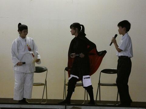 5人の有名な戦国武将を衣装や人物のものまねをしながら表現し、1人1人の人物について詳しく・分かりやすく・面白おかしい小劇でした。
