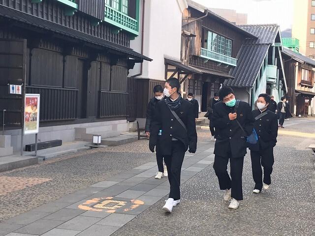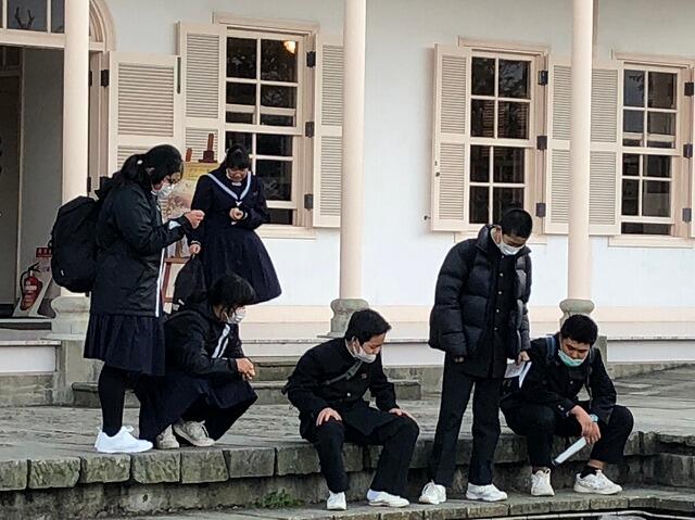 長崎に到着し、グラバー園にて何故か鯉と楽しそうに戯れる生徒たち。
