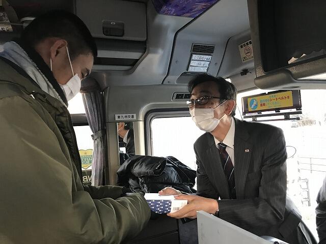 別府湾SAでトイレ休憩です。バスに乗車するときは、必ず消毒!みんな真面目にやっています。