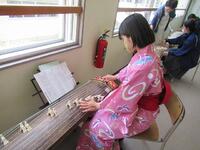 音楽の授業では、器楽の内容が行われています。各々が興味のある楽器に触れ、器楽の世界を体験するものです。写真は琴を体験している様子です。