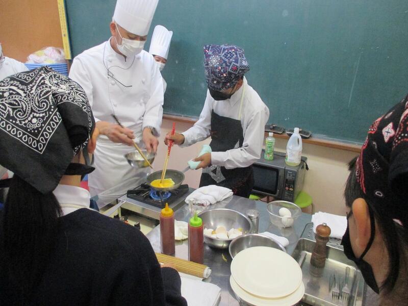 11月16日(木)の5、6校時に1、2年生対象で、日章学園中高連携講座が行われました。学年別で「プレーンオムレツ講座」と「ロボット講座」の2つの講座を受講しました。「プレーンオムレツ講座」では、プレーンオムレツを上手に作るこつや調理の基礎を学ぶことができました。コロナ禍でなかなか調理実習をする機会が少なかった生徒にとって楽しい時間になりました。「ロボット講座」では、「レゴスパイク」というソフトを使ってプログラミングの基礎を学びました。高校生に手伝ってもらいながらプログラムを組んで、思ったようにロボットが動くと歓声が上がっていました。日章学園高校の協力によって、楽しい活動をしながら日章学園高校の学科について知るよい機会となりました。