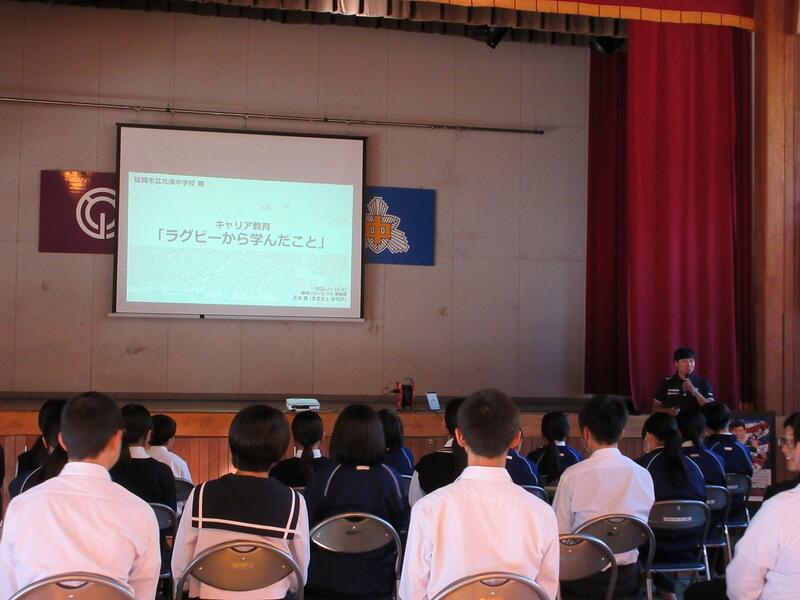 10月31日(火)の6時間目に静岡ブルーレヴズ株式会社の正本豊氏をお招きして、キャリア教育講演会を実施しました。正本氏は長らくラグビーという競技に関わりを持ち、現在はw静岡ブルーレブズの事業部に籍を置き、チームの運営や地域推進業務に関わっておられます。講話の内容は、現在の仕事に就いた経緯に始まり、自分が仕事を選ぶときに何が重要なのかについて話していただきました。正本氏は、「興味があること」「人に役立つこと」「チームワークを大事にすること」などを考えて、自分が仕事を決めたということでした。生徒にも、仕事を決定するために「自分を知ること」「興味を持ったものをとにかくやってみる」ことが大切であると語っておられました。生徒の皆さんにも是非実践して、自分の進路を切り開いていってほしいと思います。
