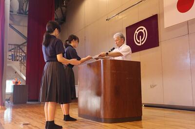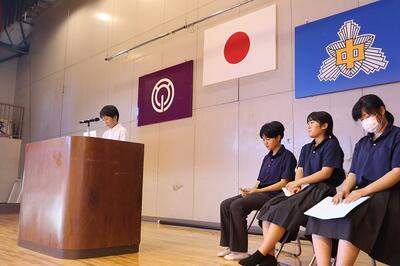 1学期の終業式では、最初に表彰が行われました。その後、各学年から代表者1名と生徒会役員から代表者1名、計4名による1学期の振り返りがありました。