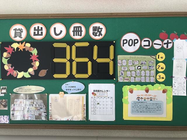 毎週月曜日に図書担当事務職員が来校し、学校図書館の整備や読書活動推進を進めています。生徒玄関には、新刊やポップの紹介など、興味関心が高まるようにいろいろな工夫がされています。