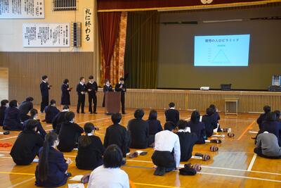 12月2日(火)に3年生が総合的な学習の時間に進めてきた課題研究の学年発表がありました。学級での発表から絞られた12グループが、今まで取り組んできた成果を発表しました。高千穂町への提案だったり、先輩から引き継いだ企画を実行したりと、どの発表も高千穂町への貢献のために取り組んできた思いが感じられました。12グループの中から選ばれた6グループは12月5日(金)に高千穂町役場にて、町長、教育長、各課課長への提案をさせていただきます。緊張する中で貴重な経験になると思います。
