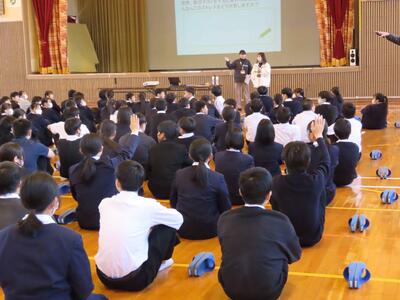 2月18日(水)に体育館にて、SOSの出し方に関する教育講話を保健師、公認心理士の方にしていただきました。ストレスが心と体に与える影響やストレスの対処方法などについて詳しく学ぶことができました。生徒たちは真剣に話を聞き、自分自身のこととして考える姿が見られました。辛い時には抱え込まず、誰かに相談することを大切にしてほしいですし、周りの友達の変化に気づいた時にも生かしてほしいです。