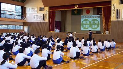 新生徒会発足に伴い、各学級の組織も改編され、11月7日(火)に後期の清掃集会を実施しました。新生徒会美化委員長が本校の清掃の取り組み方についてスライドを使いながら説明しました。本校の清掃では無言清掃と気づき清掃を心掛けています。説明後は、各清掃場所に分かれ、担当の先生による清掃の仕方についての確認がありました。なお、トイレ清掃については、担当の全生徒を職員トイレに集め、実践させながら指導するという念の入れようでした。数年後には校舎が移転新築する計画がある中、歴史ある各校舎を最後まできれいに管理できたらいいなと思います。