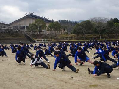 同競技場のグラウンドに集合後、送別行事の内容と準備運動が行われました。