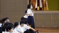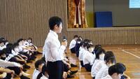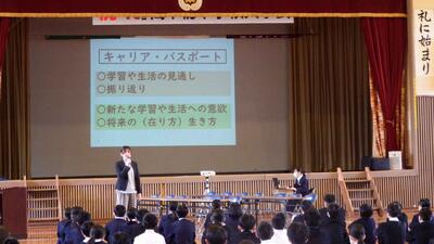 「まず、高千穂中学校のために、生徒会役員として自分から意欲的に働こうとする気持ちをもっている人がこんなにたくさんいることをとてもうれしく思います。立候補した皆さん、その積極的な姿勢は素晴らしいですね。生徒会活動は、学校で行う教育活動の中では、特別活動という重要な活動の一つに位置付けられています。この特別活動が盛んな学校は活気があり、生き生きとしています。そして生徒会活動がしっかりできている学校は、全体的に規律があり、生徒と先生方の関係がよく、PTAや地域の方々が一緒になって、学校を盛り上げている傾向が強いです。すなわち、学校としての「場の力」が備わっているということです。先ほどの14名の立候補者による演説や先日のお昼の放送による推薦責任者の主張等で、立候補者の特徴や立候補の理由、公約等を聞くことができました。この選挙で生徒会総務の5名が決定しますが、高千穂中学校をあなたのめざす学校にするために、生徒会役員としてどのようなことに取り組むのか。その取組を実行するために、どのようなプランをもっているのか。投票する生徒の皆さんは、これらの質問にしっかりと答