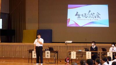 「生徒が主体的に仲間と共に考えたり、目標に向かって挑戦したりすることで、生徒会目標の具現化を図る一助とする」「生徒が自ら決定し、合意形成するための場を積極的に提供することで、コミュニケーション能力や論理的思考力の向上を図る」ことを目的とした生徒総会。今年度は、「集団の中で、相手に、自分の考えを伝えられるようになる取り組みは何があるだろうか」という議題について、各学級において2回の話し合いを経て、当日を迎えました。