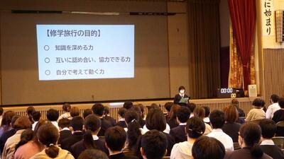 また、①目的地の文化的及び歴史的背景について学び、目的地への関心と理解を深めることで、訪問時の体験をより充実させること。②修学旅行を学びの場として捉えることの重要性を認識させ、学習に対する動機付けと意識の向上を図ること。③集団行動の際のルールやマナー、安全に関する重点項目を確認し、校外における集団生活の在り方と公衆道徳についての理解を深めることをねらいとしています。