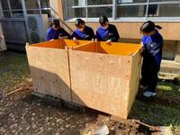 8月25日(日)のPTA奉仕作業の際、地域の方々が作ってくださった囲いを組み立てて、腐葉土を作る箱を完成させました。この腐葉土を作る箱で、落葉を使って腐葉土ができるので何度も新しい土を購入せずに済みます。そうすれば、エコで栄養も豊富な土を学校の花壇で使い続けることができます。この箱を設置するときは、暑くて囲いも重くて大変だったけど、設置してよかったなと感じました。これまでみんなで拾った落ち葉は捨てていましたが、これからはこの箱に集めて腐葉土を作り、その腐葉土で花いっぱいの花壇にしたいです。