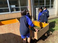 8月25日(日)のPTA奉仕作業の際、地域の方々が作ってくださった囲いを組み立てて、腐葉土を作る箱を完成させました。この腐葉土を作る箱で、落葉を使って腐葉土ができるので何度も新しい土を購入せずに済みます。そうすれば、エコで栄養も豊富な土を学校の花壇で使い続けることができます。この箱を設置するときは、暑くて囲いも重くて大変だったけど、設置してよかったなと感じました。これまでみんなで拾った落ち葉は捨てていましたが、これからはこの箱に集めて腐葉土を作り、その腐葉土で花いっぱいの花壇にしたいです。