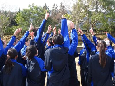 本校では、送別行事を遠足形式で実施しています。今年度も、例年同様高千穂町総合運動公園陸上競技場に行ってきました。3年生との別れに際し、お互いの感謝の気持ちを伝えあい、全校生徒で人間関係を深め合うことが大きなねらいで、生徒会が中心となって企画・運営をすることで主体的に活動できる力を身に付ける一助となればいいなと思います。