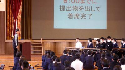 「生徒が主体的に仲間と共に考えたり、目標に向かって挑戦したりすることで、生徒会目標の具現化を図る一助とする」「生徒が自ら決定し、合意形成するための場を積極的に提供することで、コミュニケーション能力や論理的思考力の向上を図る」ことを目的とした生徒総会。今年度は、「集団の中で、相手に、自分の考えを伝えられるようになる取り組みは何があるだろうか」という議題について、各学級において2回の話し合いを経て、当日を迎えました。