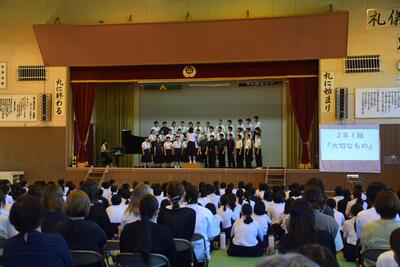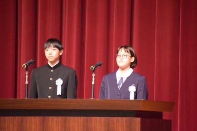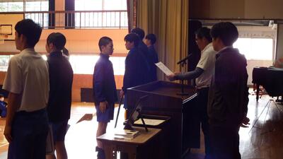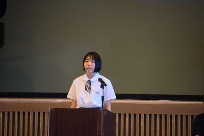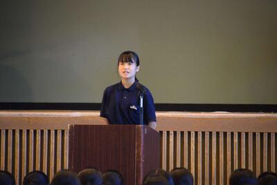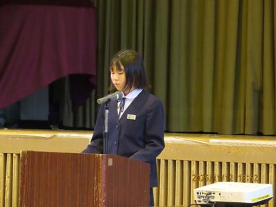 1年生の原田 紗和寧(はらだ さわね)さんは、「2学期を通して、自ら行動し自分の意思を伝えていくことの大切さを改めて学びました。」また、「合唱コンクールに向けての練習の中で、何事にも勇気をもって行動していけば、自分やクラスを変えることができるということを学びました。」そして、「そういったことを3学期にどう生かせるのかをしっかりと考え、クラスも自分も成長できたと言えるような一年にしていきたい。」と、クラスが守れなかった移動教室などの失敗を3学期にどう克服するかという新たな目標を立てていましたね。