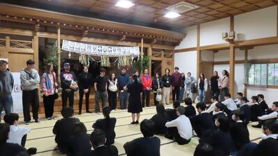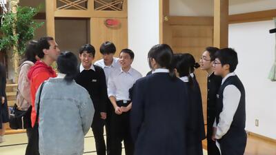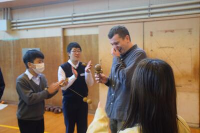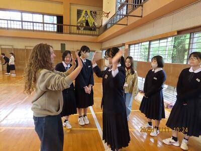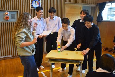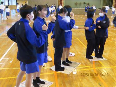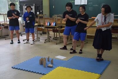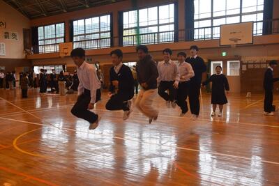 11月11日(火)に熊本大学の留学生7名と3年生が体育館にて交流会を実施しました。3年生が高千穂町や高千穂中学校の紹介を英語でしたのち、留学生と一緒にけん玉や福笑い、だるま落としなどをして交流しました。知っている言葉やジェスチャーで伝えようとしたことは貴重な経験でしたし、多くの言葉を交わすことはなくても、お互い楽しい時間を過ごすことができた2時間でした。