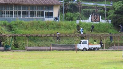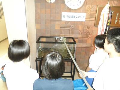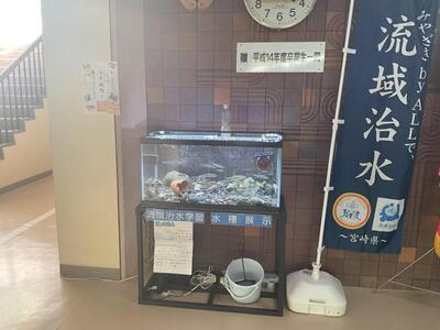 10月2日(木)、玄関を入ったところに2つの水槽を設置しました。というのも、総合的な学習の時間に流域治水について課題研究している3年生を中心に、10月4日(土)、日之影川(日之影町)と曽木川(延岡市北方町)にて、県と国土交通省が開催した「『流域治水』を学ぶプロジェクト」に参加し、採集した魚などを育てるためです。生徒たちも通るたびに眺めています。来校された際は、ぜひご覧ください。