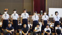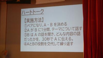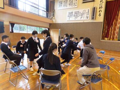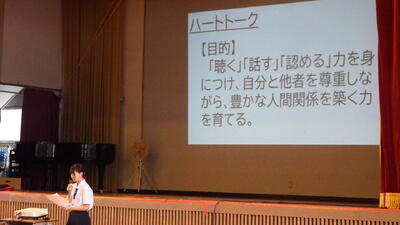本校では「聴く」「話す」「認める」力を身に付け、自分と他者を尊重しながら、豊かな人間関係を築く力を育てるために「ハートトーク」を週2回程度実施します。方法は以下の写真のとおりです。実行委員長の甲斐りおなさんが説明を行い、実際に2人組になって全校生徒で行いました。経験を積み重ね、成長する姿が楽しみです。