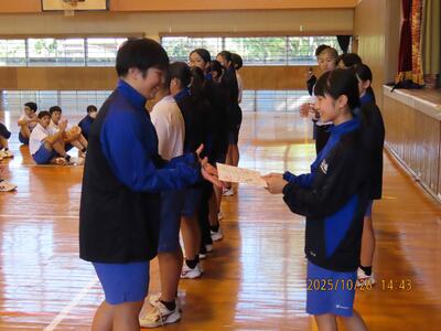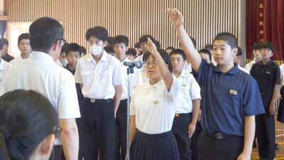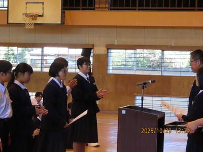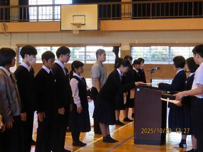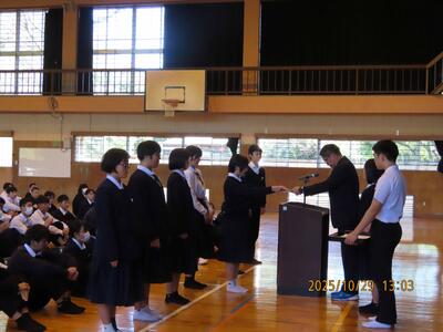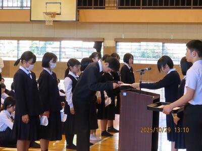10月29日(水)に生徒会役員退任式・任命式を実施しました。旧生徒会は1年間、学校行事や日々の活動に学校のリーダーとして本当によくがんばりました。先日の生徒会選挙演説会の中で立候補者が「生徒会にあこがれて立候補した」という言葉がありました。生徒会のこの1年の活躍を象徴する言葉だと感じました。新役員がいよいよ動き出します。伝統を引き継ぐとともに、それぞれの良さを発揮して新たな伝統を作ってほしいです。