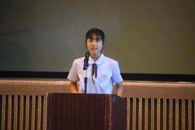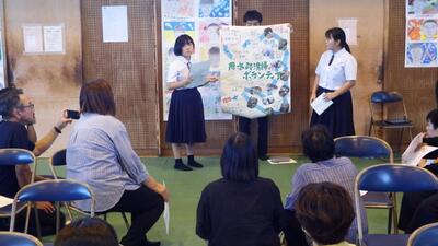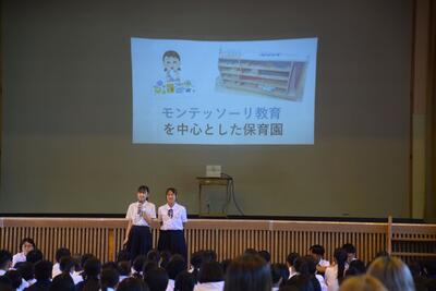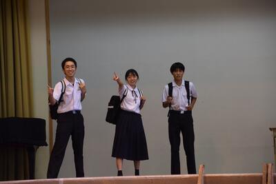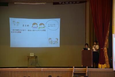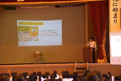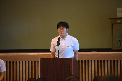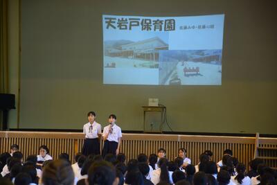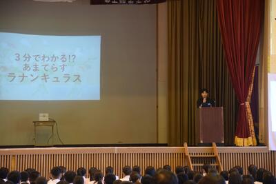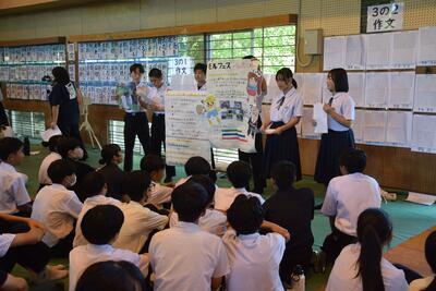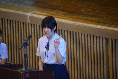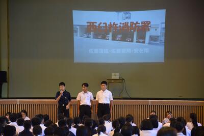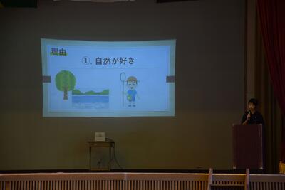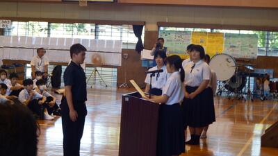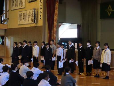 そこで、受賞作品を11月12日(水)に体育館にて全校生徒の前で発表してもらいました。二人とも実体験や調べた知識をもとにまとめており、県1位、全国大会出場にふさわしい発表でした。