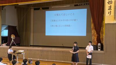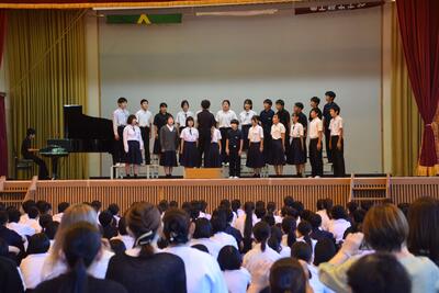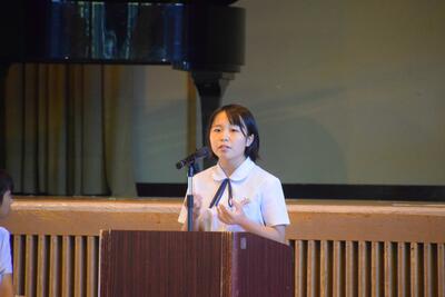 2年生の伊藤 恵茉(いとう えま)さんは、「学年全体で失敗することもありましたが、成長できた学期でもありました。」また「失敗したことから学び、よくできたところは継続できる学年になれるようにしていきたいです。」と。そして「全員が夢をもち、それを叶えるための努力ができるような3年生になりたい。」と語ってくれました。まさに、失敗から学ぶことの大切さを発表してくれました。