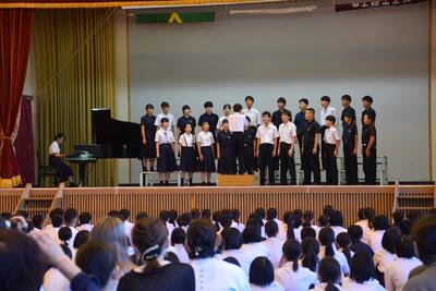 私が思う、この2学期一番の成長は、クラスの団結力です。特に紅葉祭は、私たちの学級を成長させてくれました。合唱の練習を始めた当初は、まとまりがなくバラバラでした。私自身も指揮者を務めましたが、正直、人前に立って人に指示を出したり、みんなをまとめたりすることに苦手意識がありました。だから、指揮者になったばかりのころは何もできませんでした。しかし、クラスのみんなが一生懸命に合唱を頑張る姿を見て、このままではいけないと思い、どんどん指示を出すことを心がけました。すると、少しずつですが、指揮者としてクラスをまとめられるようになってきました。そして、練習を重ねるうちにみんなの気持ちがひとつになり、最優秀賞という素晴らしい賞を取ることができました。