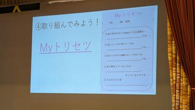 10月20日(月)に、生徒会から「言葉遣い」についての現状やこれからのことについて話がありました。そして、今後の取組として「Myトリセツ」と題して「私が言われてhappyになる言葉」、「私にとってのNGワード」などを記入した用紙を学級に掲示し、相手を理解して会話をすることで、傷つけないようにしていこうとする取組が提案されました。この取組は8月に開催された「いじめ問題子供サミット」にて他の学校が取り組んでいたことを参考にしたものです。生徒会が新役員に変わる直前に最後の活動となるこの取組。今までよりもさらに相手のことを思って話しをしたり、接したりできるようになることを願います。