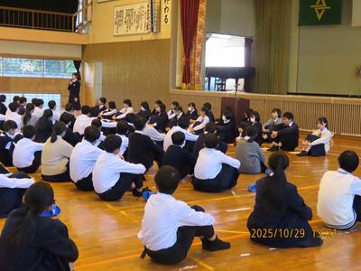 1,2年生を対象に「性教育」を実施しました。高千穂町保健福祉総合センターより2名の講師の方をお迎えし、充実した授業となりました。この授業を通して、生徒自身が「SNSに潜む危険」や「人と接するときのエチケット」、「自身の心と体の変化」等について向き合い、考える良い機会となりました。特に、パーソナルスペースの距離感について、人によってかなり違いがあることをあらためて認識することができたようです。今後の生活にしっかりと生かしていきたいと思います。ありがとうございました。
