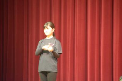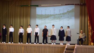 11月8日(土)に高千穂町武道館にて「町民の集い」が開催されました。開会行事の「高千穂町民憲章朗唱」では、2年生の冨高桜子さんと甲斐翔大さんがステージ上で堂々と朗唱しました。その際に1年生の甲斐理依菜さんが大人、高校生と一緒に手話通訳をしました。中学生も高千穂町の行事を町民の方々と一緒に盛り上げました。