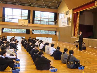 「おはようございます。寒くなってきました。持久走をするにはベストコンディションですね。今年も駅伝・ロードレース大会を実施できることをうれしく思いますが、みなさんはそうでもないかもしれませんね。持久走は、正直きつい種目です。己との戦いが待っています。それでもあえて実施するのは、困難なことを乗り越えたときの自己実現という至福の喜びを味わってほしいからです。後半には、クラス対抗の駅伝が実施されます。先日本校の女子が県の駅伝で3位に入賞しました。九州大会まであと9秒。応援に来られていた各学校の校長先生からもたくさんのお褒めの言葉をいただきました。駅伝には、1本のたすきをチーム